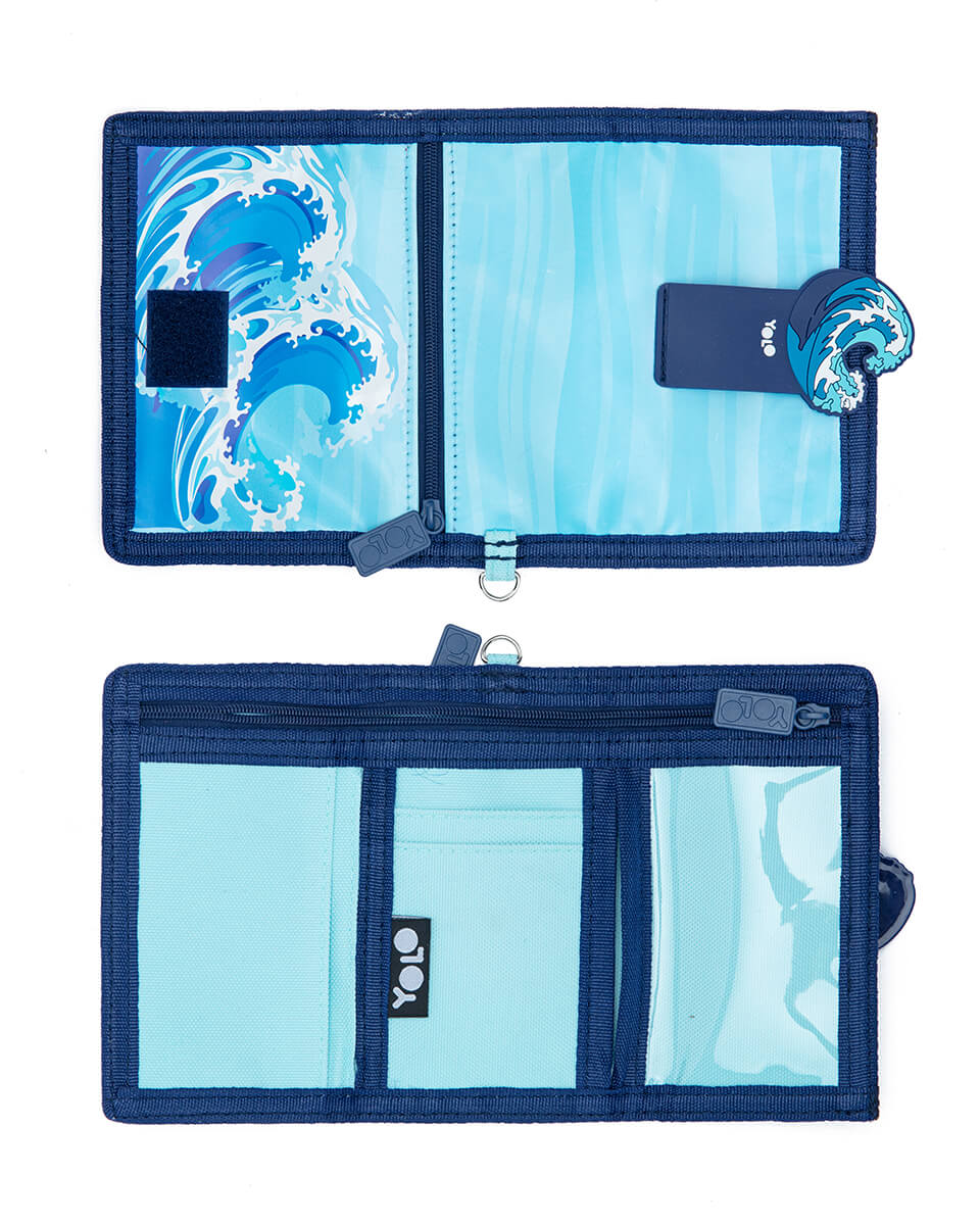 Παιδικό πορτοφόλι με λουράκι της YOLO. Τρίπτυχο με θήκες για κέρματα και χαρτονομίσματα, velcro κούμπωμα και λουράκι για να το κρεμάς στον λαιμό.